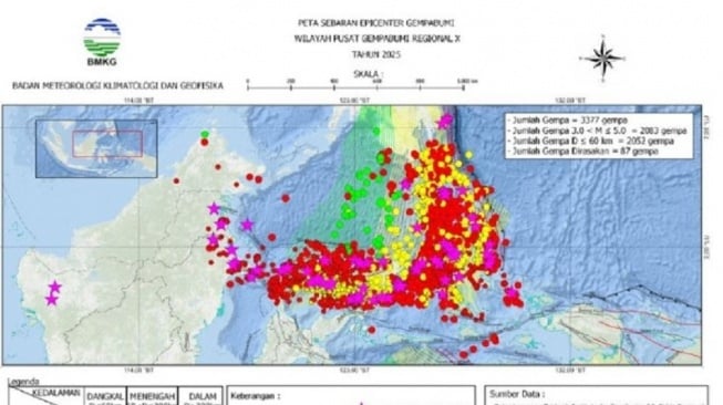 SuaraSulsel.id - Badan Meteorologi, Klimatologi, dan Geofisika (BMKG) Stasiun Geofisika Manado mencatat sebanyak 3.377 kejadian gempa bumi tektonik menggetarkan wilayah Sulawesi Utara (Sulut) dan sekitarnya sepanjang tahun 2025.