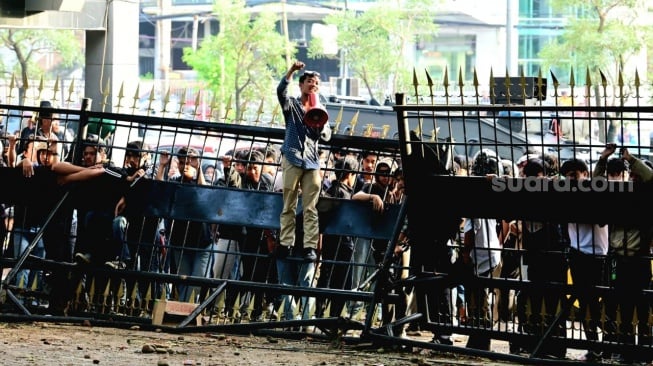 Tak lama berselang, aksi berubah ricuh. Sejumlah demonstran merusak pagar pintu masuk kantor gubernur dan melempari petugas Satpol PP dengan batu.
