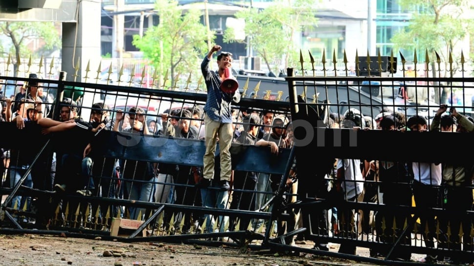 Bahkan, petugas sempat mundur hingga ke bagian belakang kantor gubernur karena derasnya lemparan batu dari massa.