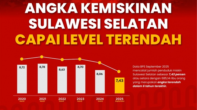 - BPS Sulsel mencatat tingkat kemiskinan per September 2025 adalah 7,43% (685,14 ribu jiwa), terendah dalam enam tahun terakhir.
